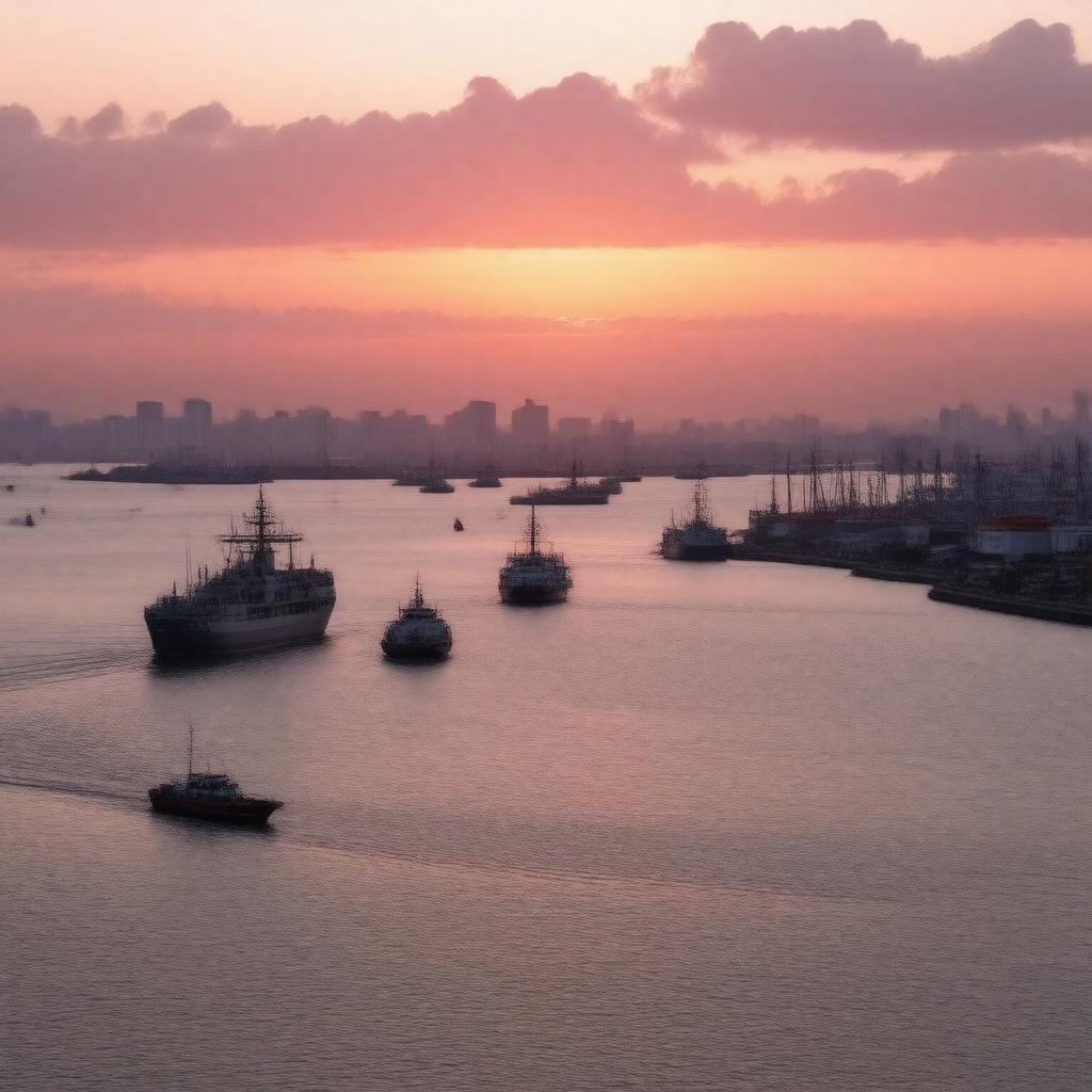 "Generate a realistic image of Manila Bay, a bay located in the Philippines, with a serene sunset in the background, showcasing its 60-kilometer length and 48-kilometer width, with several ships and boats docked at the Port of Manila and Navotas Fish Port Complex, surrounded by the Metro Manila and Luzon landscape, highlighting its significance as a harbor, tourist destination, and fishing ground."