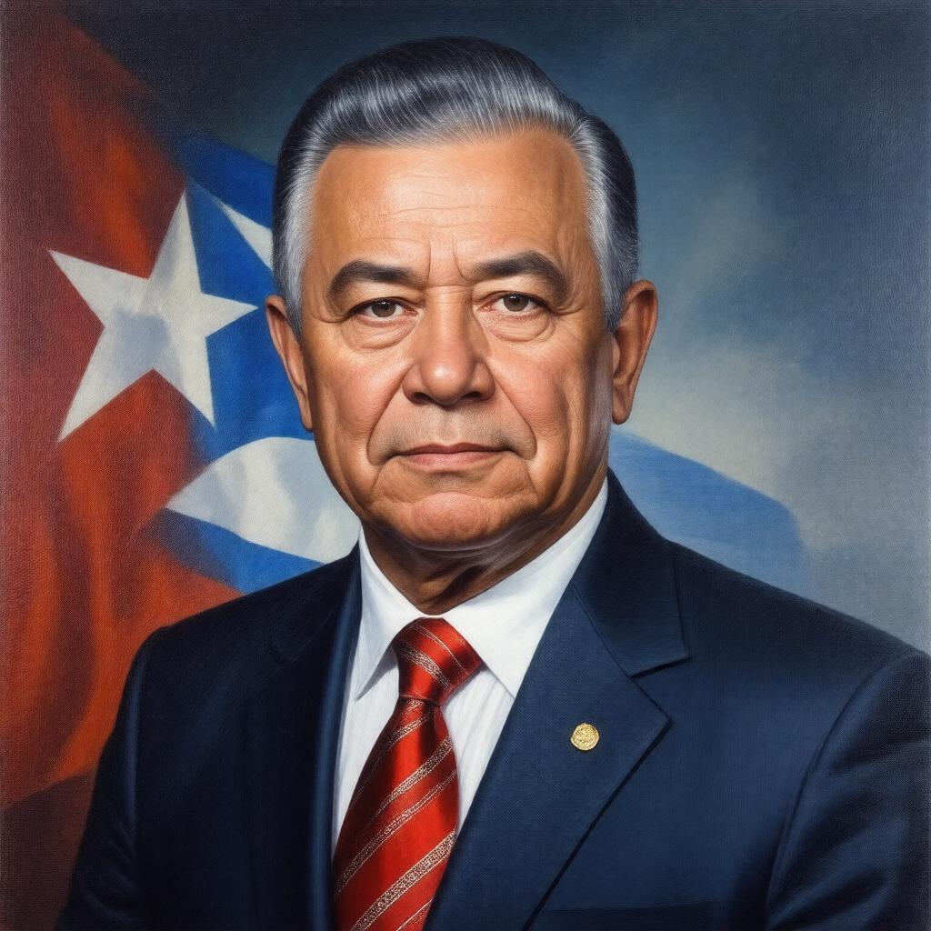 Generate a realistic portrait of Manuel Marrero Cruz, the current Prime Minister of Cuba, in a formal setting, wearing a suit and tie, with a subtle Cuban flag in the background, symbolizing his role in Cuban politics, specifically highlighting his position as Prime Minister since December 21, 2019, and his contributions to Cuban tourism development.
