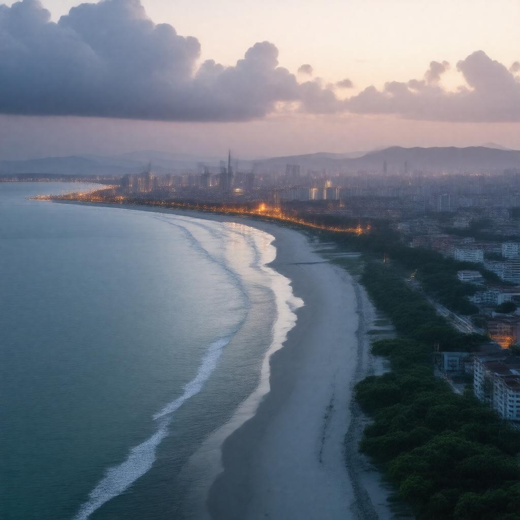 "Generate a realistic image of Maoming, a prefecture-level city in Guangdong Province, China, showcasing its beautiful beaches, lush lychee orchards, and bustling petrochemical industry, with a stunning backdrop of subtropical monsoon climate, at dusk with a warm China Standard Time glow."