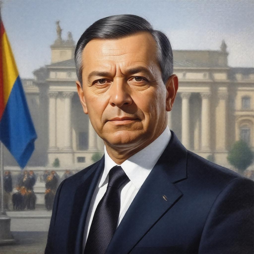 Generate a realistic image of Marcel Ciolacu, a Romanian politician, in a formal setting, possibly wearing a suit and tie, with a confident expression, as the Prime Minister of Romania, with the Romanian flag or a governmental building in the background, in a style that reflects his professional and authoritative personality.