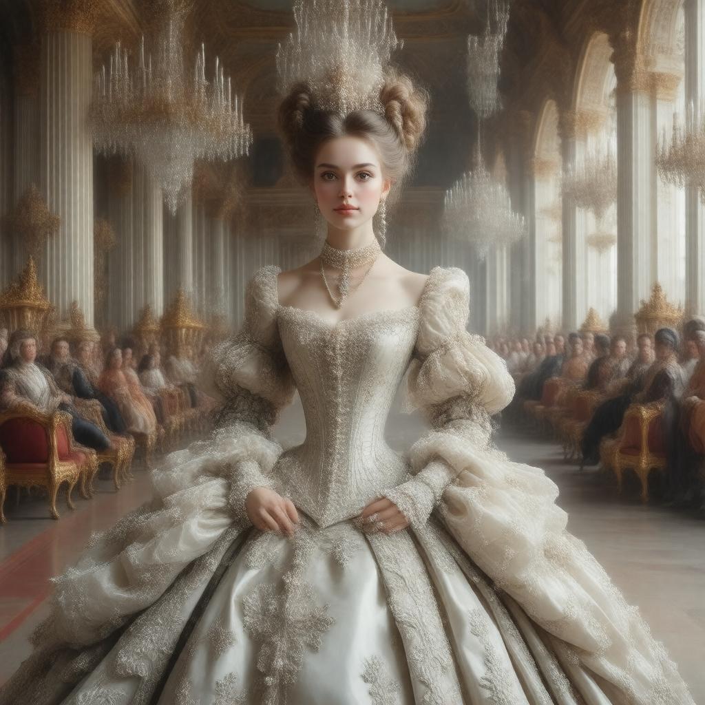 "Generate an image of Marie Antoinette, Queen consort of France, in a lavish 18th-century French court dress, adorned with intricate lace, pearls, and a lavish hairstyle, standing in a grand throne room with opulent furnishings and ornate chandeliers, exuding elegance and refinement, in the style of a formal portrait by Élisabeth Vigée Le Brun."