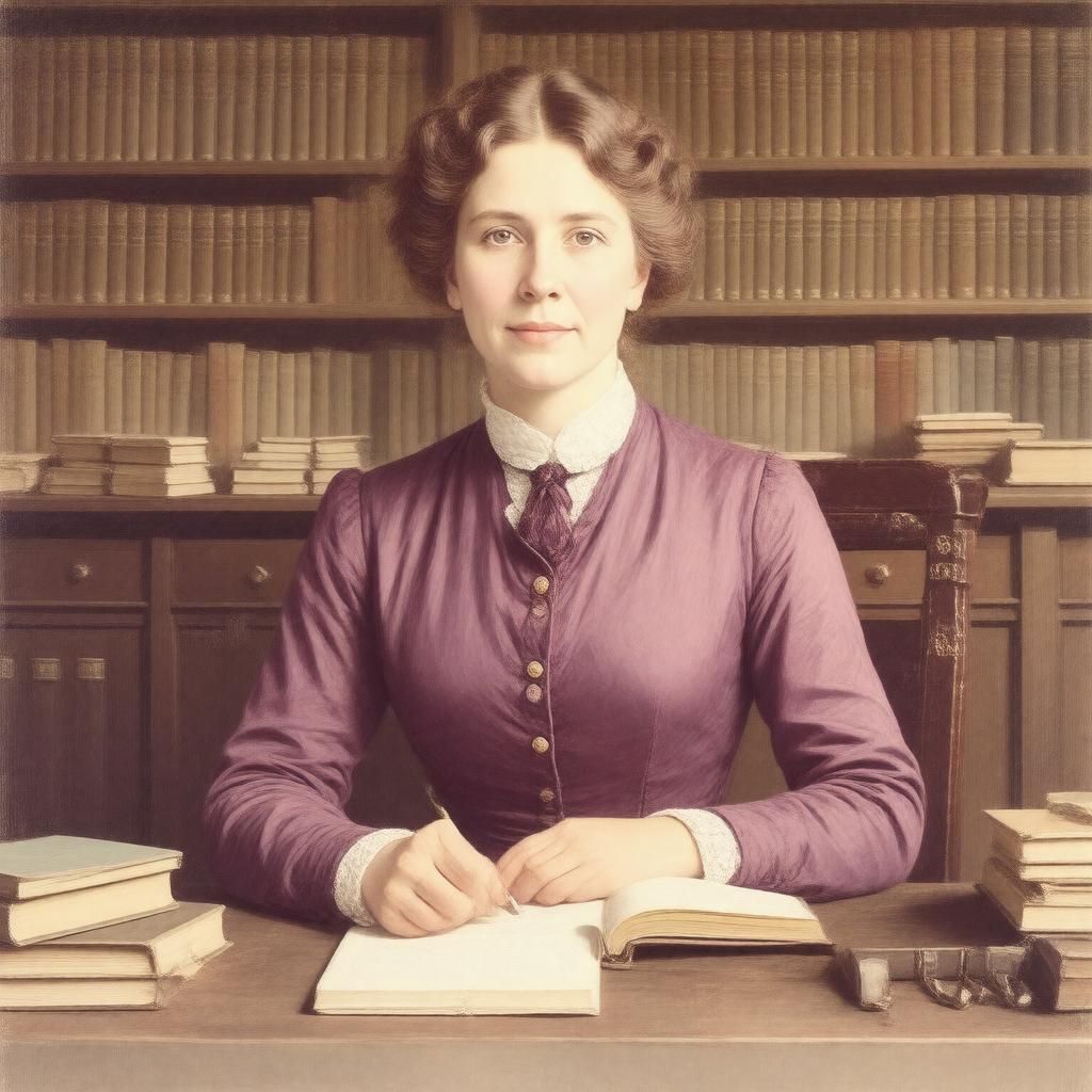 "Create a realistic portrait of Marie Charlotte Carmichael Stopes, a British author, botanist, and birth control advocate, in a style that reflects her pioneering and intellectual personality, sitting in a library with books and papers around her, wearing attire typical of the early 20th century, with a subtle background that hints at her contributions to women's reproductive rights and family planning."