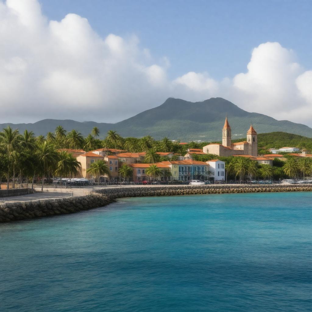 "Generate an image of a picturesque Caribbean coastal town with a bustling harbor, featuring colorful buildings, palm trees, and a fort in the background. The town, Marigot, is situated on the French part of the island of Saint Martin, with the Caribbean Sea in the foreground and a mountainous landscape in the distance. Include the St. Martin of Tours Church, Marigot Market, and Fort Louis as notable landmarks. The image should reflect a warm, sunny day with a few clouds, capturing the essence of a vibrant and charming tropical town."
