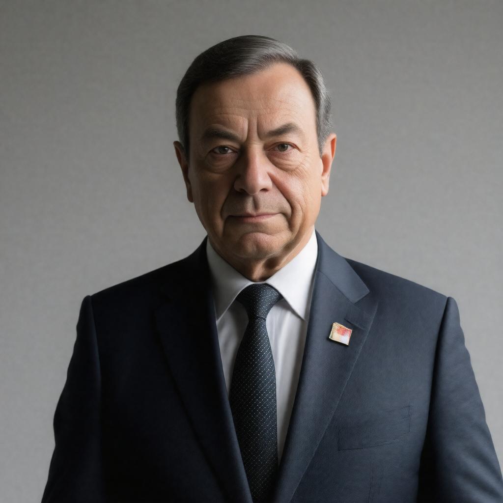 Create a realistic image of Mario Draghi, a 74-year-old Italian economist, banker, civil servant, and politician, standing in a formal setting with a subtle background that hints at his roles in European and Italian finance. He should be dressed in a well-tailored suit, possibly with a tie, and have a serious yet approachable expression. Incorporate subtle elements that reflect his Italian heritage and his significant roles, such as a faint European Central Bank logo or an Italian flag pin. Capture the essence of a leader who has navigated complex economic landscapes with confidence and authority.