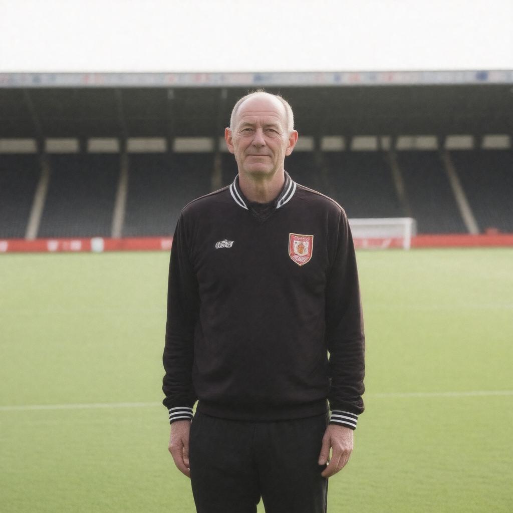 Generate a realistic image of Mark Kinsella, a middle-aged Irish former footballer and manager, standing in a football stadium with a nostalgic background of a football pitch, wearing a nostalgic football kit, possibly from one of the teams he played for, such as Charlton Athletic F.C. or Aston Villa F.C., with a subtle smile, looking reflective, in a photorealistic style.