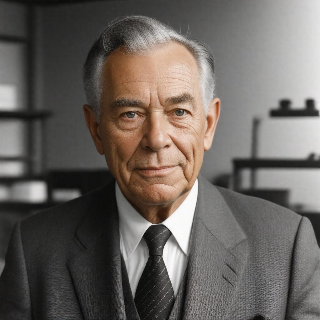 Generate a realistic image of a middle-aged to elderly man with a dignified appearance, wearing formal attire, possibly a suit and tie, with a subtle background that hints at his connection to science and academia. The man should have a gentle yet authoritative expression, with a slight smile. He is to be depicted indoors, possibly in a setting that reflects his achievements in physics, such as a laboratory or a university environment. The style should be photorealistic, capturing the essence of a prominent figure in the field of nuclear physics. The subject is Mark Oliphant, an Australian physicist known for his discoveries and contributions to nuclear physics and his involvement in the Manhattan Project.