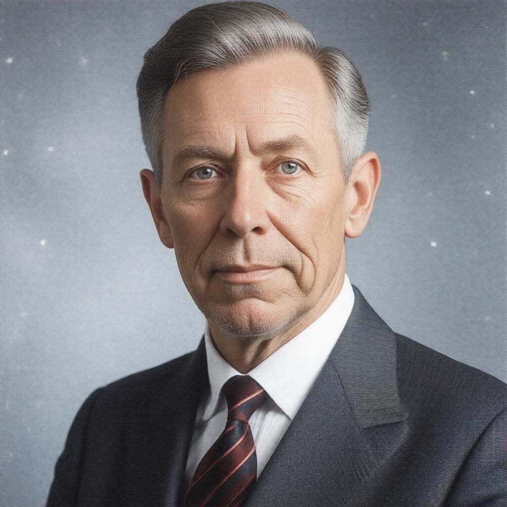 Generate an image of a realistic portrait of Martin John Rees, a middle-aged British astronomer and author, with a gentle expression, wearing formal attire, possibly with a subtle background hinting at his connection to astronomy, such as a faint image of stars or a telescope, in a style that reflects his dignified and professional demeanor, suitable for a prominent figure in the field of cosmology and astrophysics.