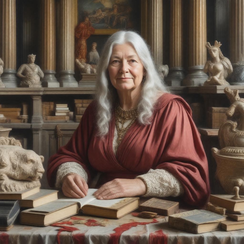 "Create a realistic portrait of Dame Winifred Mary Beard, a renowned British classicist, author, and television presenter, sitting in a classic Cambridge college setting, surrounded by ancient Roman artifacts and books, with a warm and authoritative expression, in a style reminiscent of a formal photograph, with a muted color palette and a sense of quiet confidence."