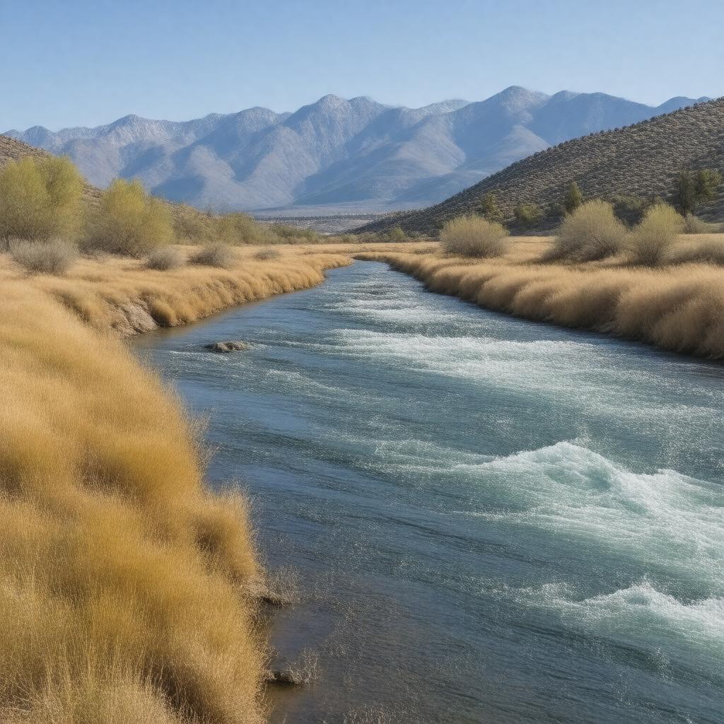"Generate a serene landscape image of Marys River, a 60-mile-long river in Nevada, United States, flowing gently through Elko County with the Ruby Mountains in the background and meeting the Humboldt River near Elko, in a realistic style."