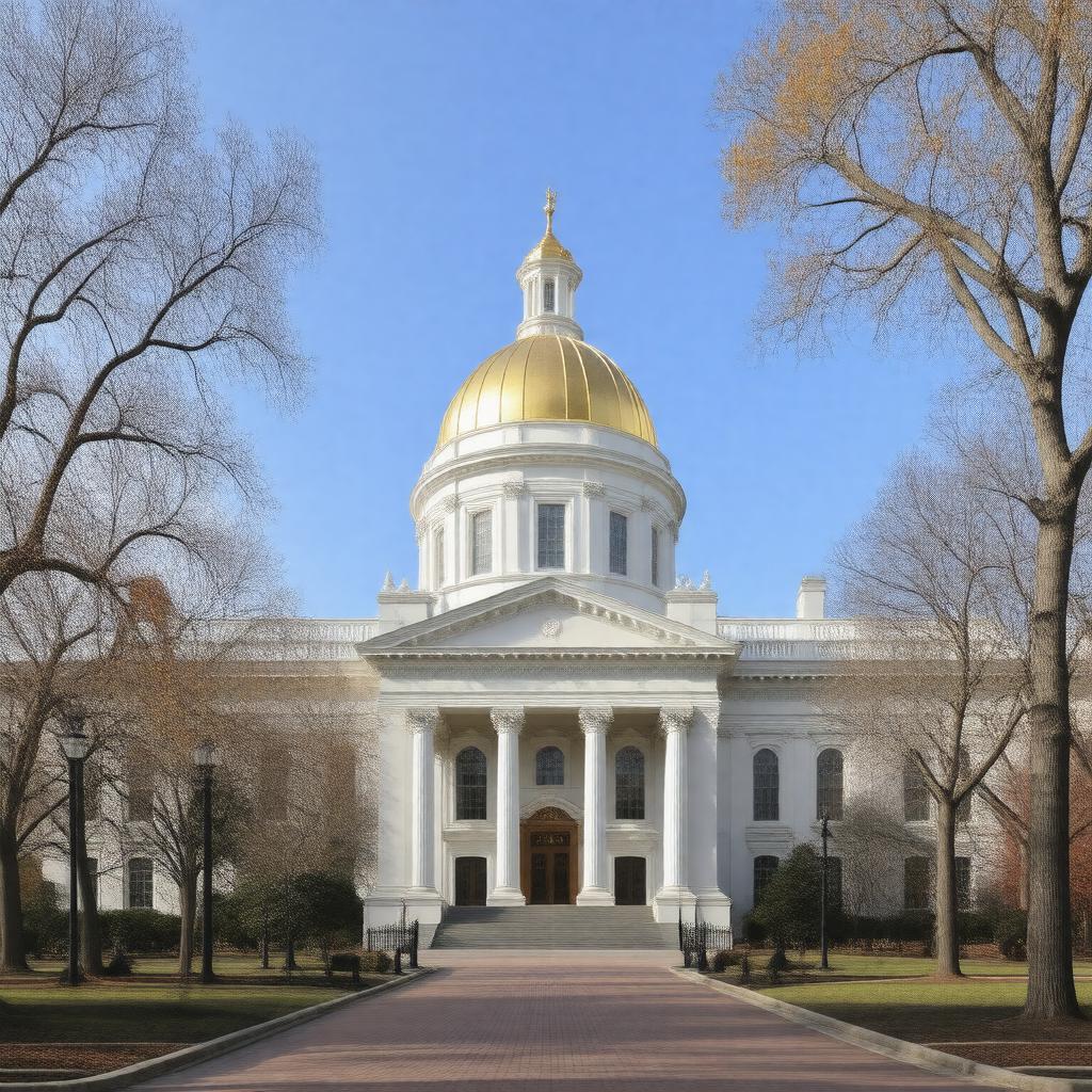 "Generate a realistic image of the Massachusetts State House, a historic state capitol building located at 24 Beacon Street in Boston, Massachusetts, United States, featuring its iconic golden dome and Federal architecture style, set against a clear blue sky with the building's surroundings and landscape accurately depicted."