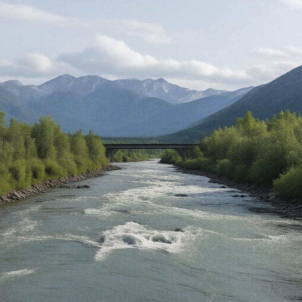 "Generate a serene landscape image of the Matanuska River, a 142 km long river in Alaska, United States. The river should be depicted flowing through the Matanuska-Susitna Borough, with surrounding mountains and lush greenery. In the distance, the Matanuska Glacier can be seen, with the river's source and mouth, Knik Arm, visible. Include a bridge, specifically the Glenn Highway Bridge or Old Glenn Highway Bridge, spanning the river. The style should be realistic, highlighting the scenic views and tranquil atmosphere of the river, perfect for whitewater rafting. Incorporate a few whitewater rapids to showcase the river's adventurous side."