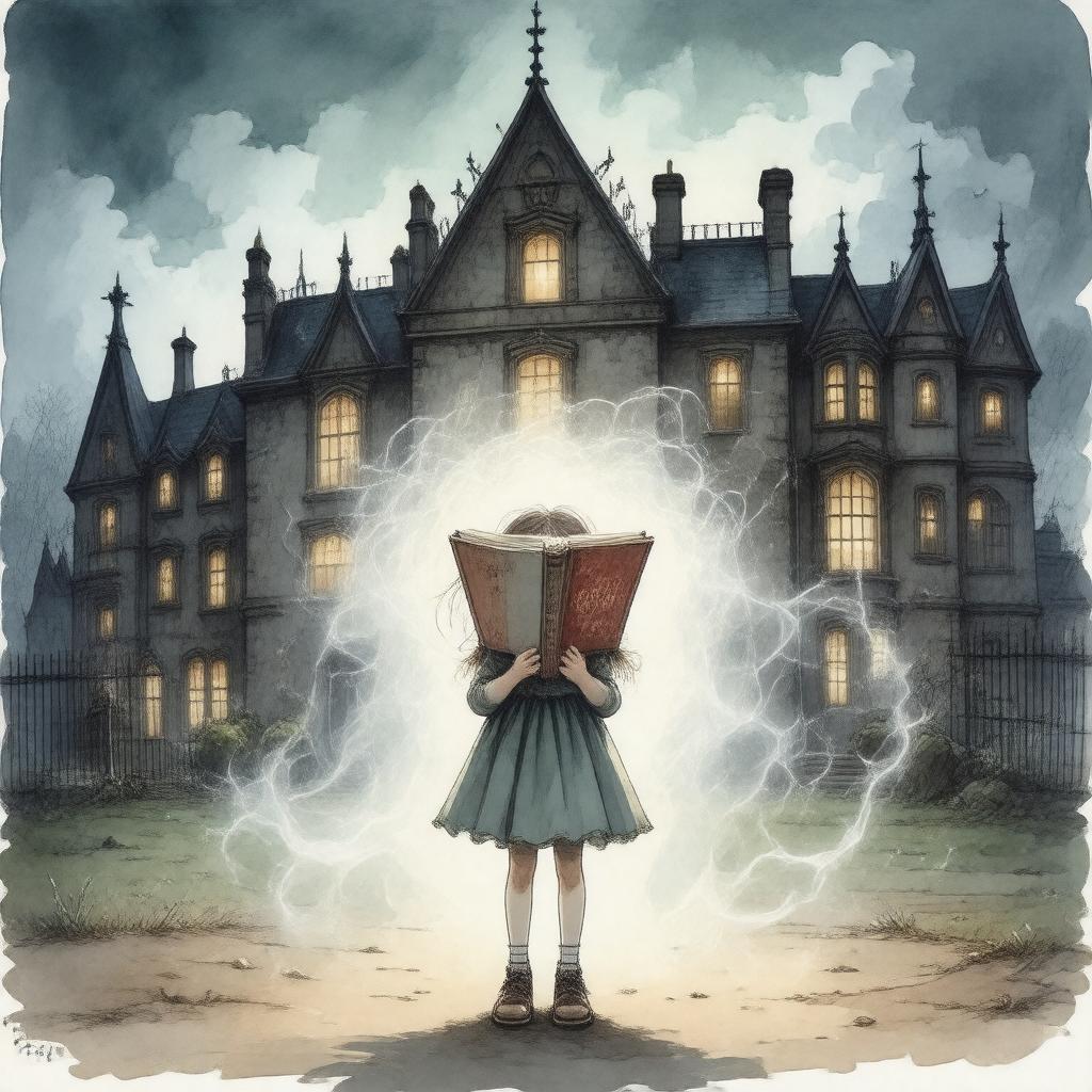 "Illustrate a cover of the novel 'Matilda' by Roald Dahl, featuring a young girl with a book and a telekinetic aura around her, standing in front of a dark and ominous backdrop of a large, old-fashioned school building, with a hint of fantasy and whimsy in the style of Quentin Blake."