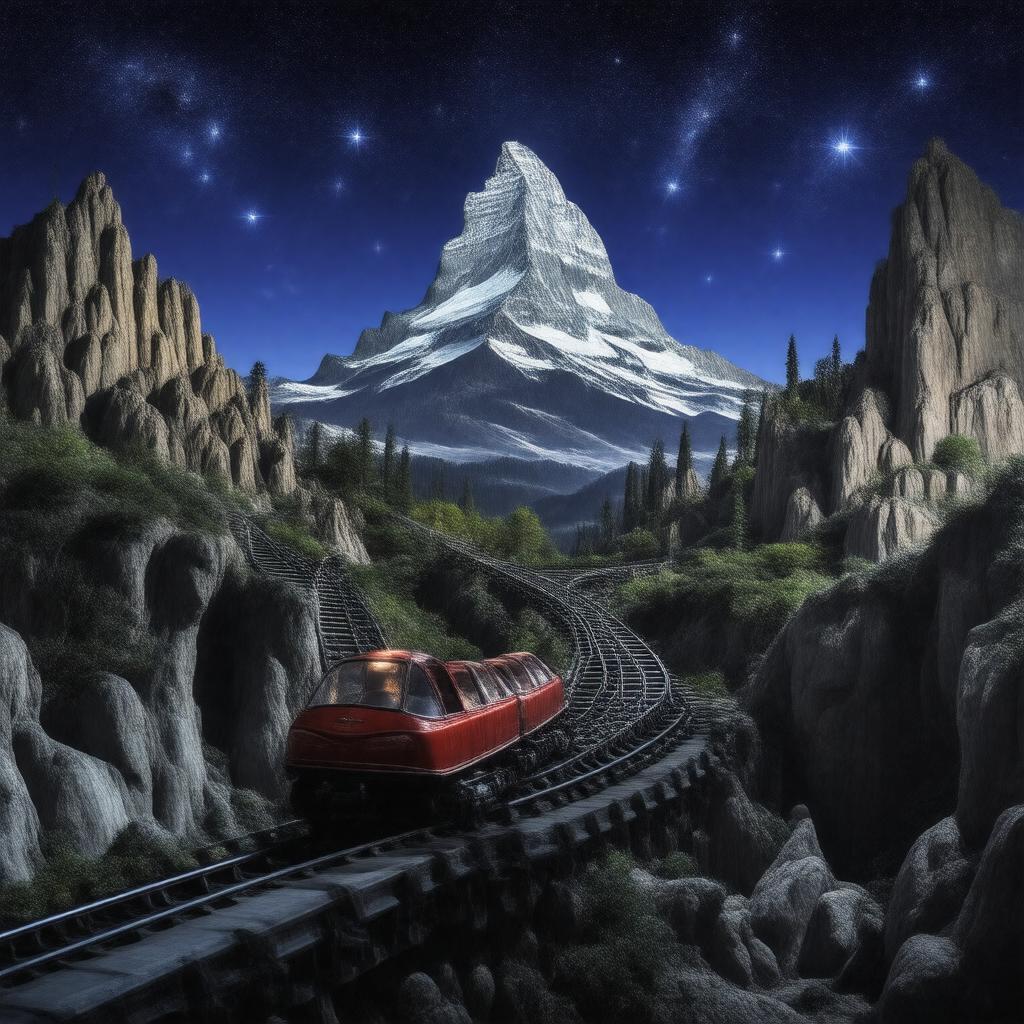 "A nighttime view of the iconic Matterhorn Bobsleds roller coaster at Disneyland, Anaheim, California, with its distinctive mountain facade and tubular steel tracks illuminated, featuring bobsled vehicles speeding along the 2,037-foot long track, surrounded by Fantasyland and Tomorrowland scenery, with the animatronic Yeti peering out from its cave, under a starry night sky."