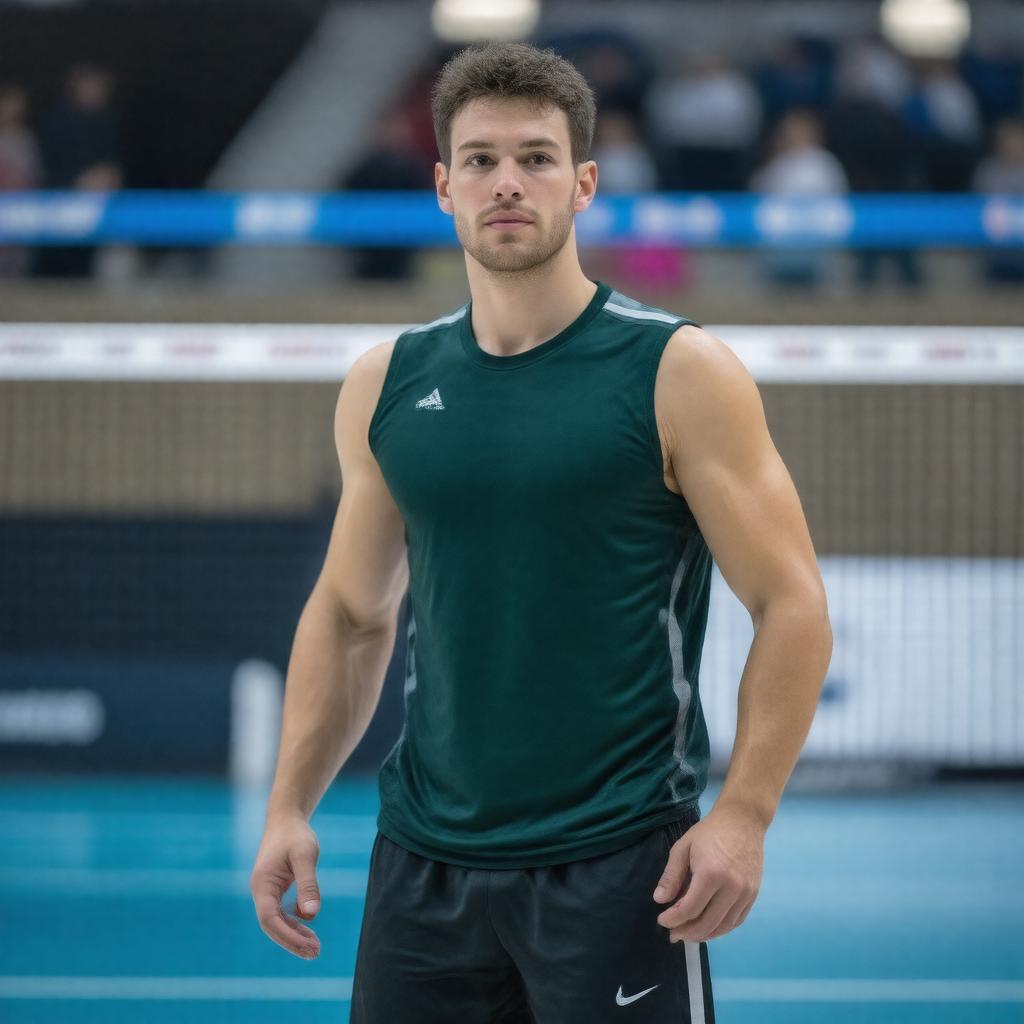 Generate a realistic image of Matthew Anderson, an American professional volleyball player, in his sports attire, likely on a volleyball court or with a volleyball-related background, highlighting his occupation as a volleyball player, specifically as an outside hitter or opposite hitter, with a tall and athletic build, around 2.08 meters in height, with a focused expression, possibly in action or in a celebratory pose, wearing a team jersey or uniform, incorporating elements that reflect his achievements such as Olympic medals, FIVB titles, or NCAA championships.