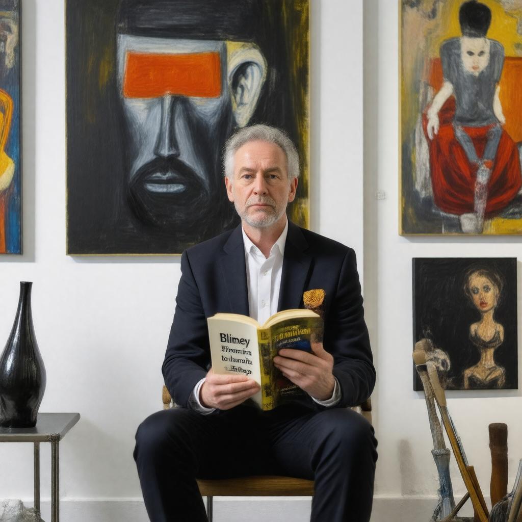 "Create a realistic portrait of Matthew Collings, a British art critic, broadcaster, and writer, sitting in a modern art gallery surrounded by contemporary art pieces, with a thoughtful expression, wearing a suit and holding a book, possibly 'Blimey: From Bohemia to Britpop' or 'This is Modern Art', with a subtle background hinting at his London residence, in a style that blends traditional and digital media, reflecting his eclectic personality and expertise in contemporary art."