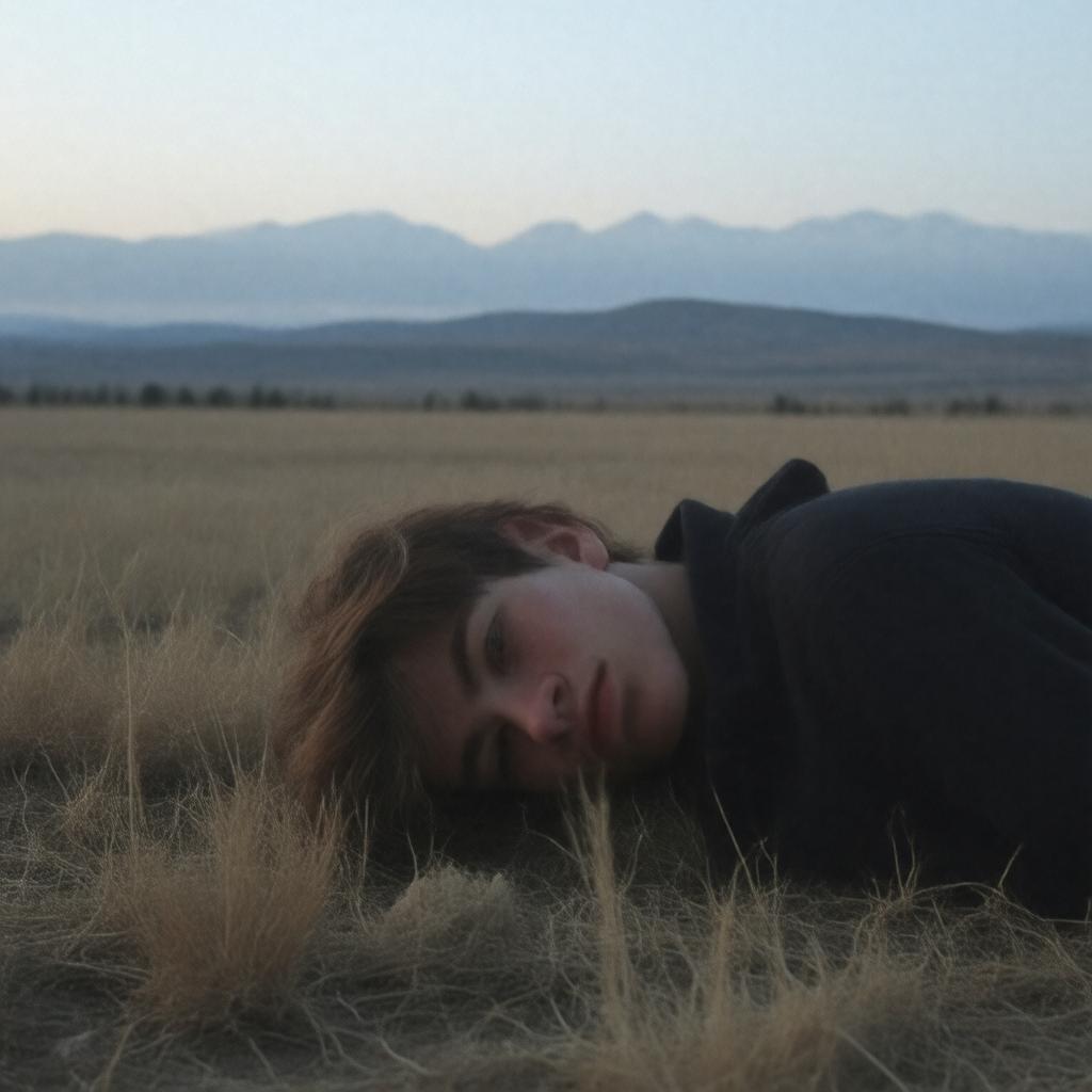 Generate an image of Matthew Shepard, a young American man, lying on the ground in a desolate field at dusk, with a faint outline of the Wyoming landscape in the background, symbolizing the tragic and violent end to his life as a victim of a hate crime, in a somber and realistic style.