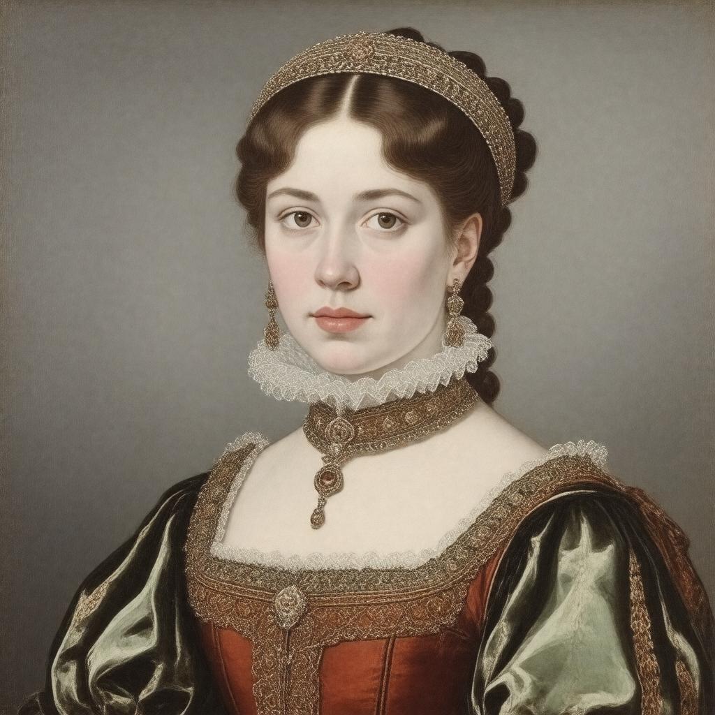 "Generate a realistic portrait of Maud Green, a 16th-century English noblewoman, Lady Parr, in formal attire, reflecting her status and elegance, with a subtle background hinting at her connection to Blackfriars, London, where she was buried, in the style of a Renaissance-era oil painting."