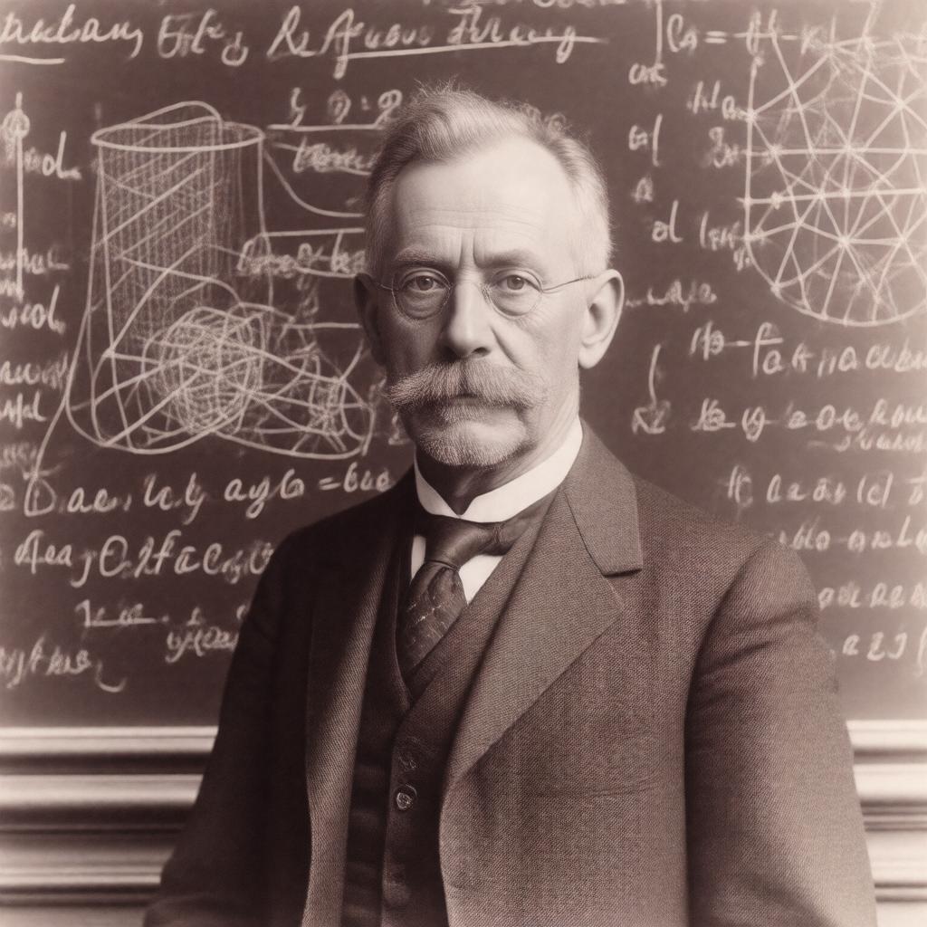 "Generate a realistic image of a middle-aged Max von Laue, a German physicist, in a formal attire, standing in front of a blackboard filled with complex physics equations, with a subtle background of X-ray diffraction patterns, symbolizing his groundbreaking work in the field of physics, particularly in X-ray diffraction and crystallography, awarded the Nobel Prize in Physics in 1914."