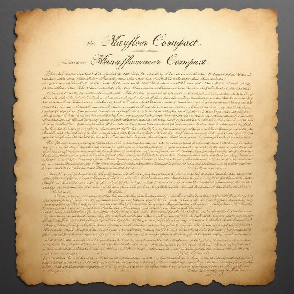 "Create an image of a historic document, specifically a colonial-era parchment, with a bold signature at the top and 41 distinct signatures below, representing the Mayflower Compact, a foundational document of American history, signed on November 11, 1620, aboard the Mayflower in Provincetown Harbor, establishing a framework for self-government and order in the Plymouth Colony."
