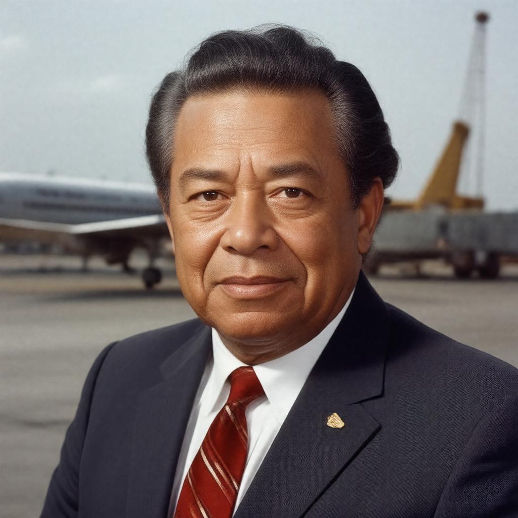 "Generate a realistic portrait image of Maynard Jackson, the first African-American mayor of Atlanta, Georgia, in a formal setting, reflecting his occupation as a politician and lawyer, with a dignified expression, wearing a suit and tie, incorporating subtle hints of his notable achievements, such as a faint image of an airport or a construction site in the background, symbolizing his efforts in expanding Atlanta's airport and promoting affirmative action in city contracts."