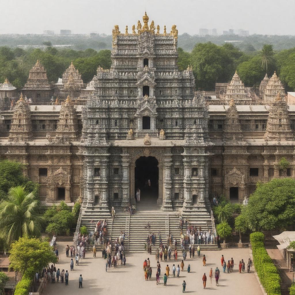 "Generate an image of the majestic Meenakshi Temple, a prominent Hindu temple located in Madurai, Tamil Nadu, India, showcasing its stunning Dravidian architecture, intricate sculpture, and vibrant gopurams, with the main deities Meenakshi and Sundareswarar at its core, surrounded by lush gardens and a bustling courtyard, capturing the essence of this ancient temple complex."