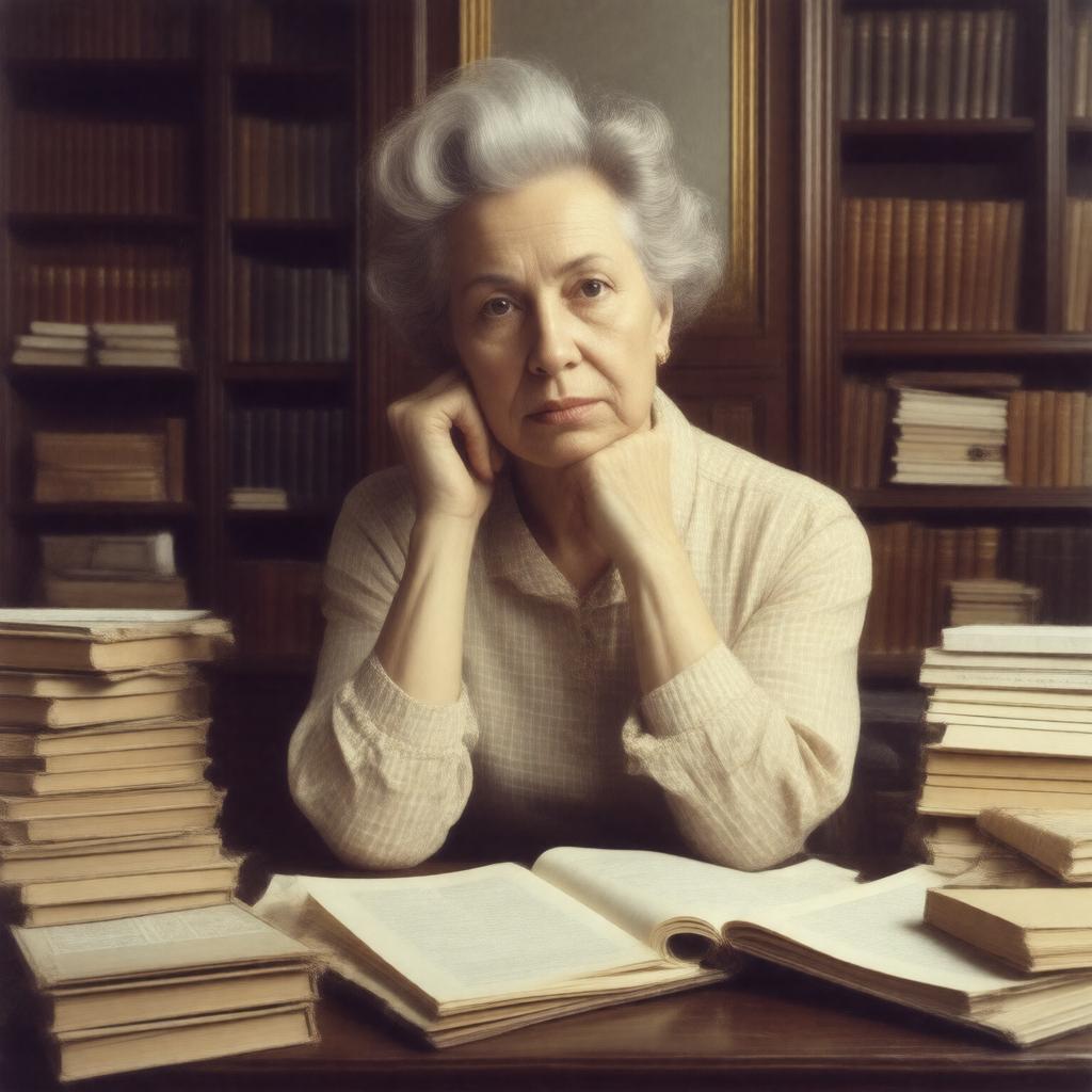 "Create a realistic portrait of Melanie Klein, a middle-aged female Austrian-British psychologist, in a contemplative pose, surrounded by books and papers, with a subtle background hinting at her Jewish heritage and her London residence, in a style reminiscent of 1950s portrait photography."