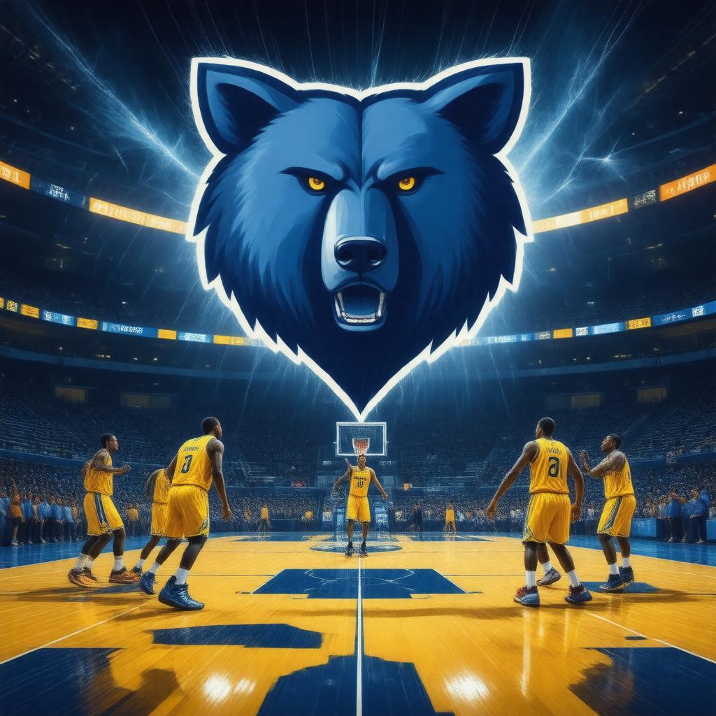 "Generate an image of the Memphis Grizzlies basketball team logo or a scene depicting the team playing at the FedExForum, incorporating the team's colors - navy blue, Beale Street blue, smoke blue, yellow, and gray, with a dynamic and energetic style, set in Memphis, Tennessee, United States."