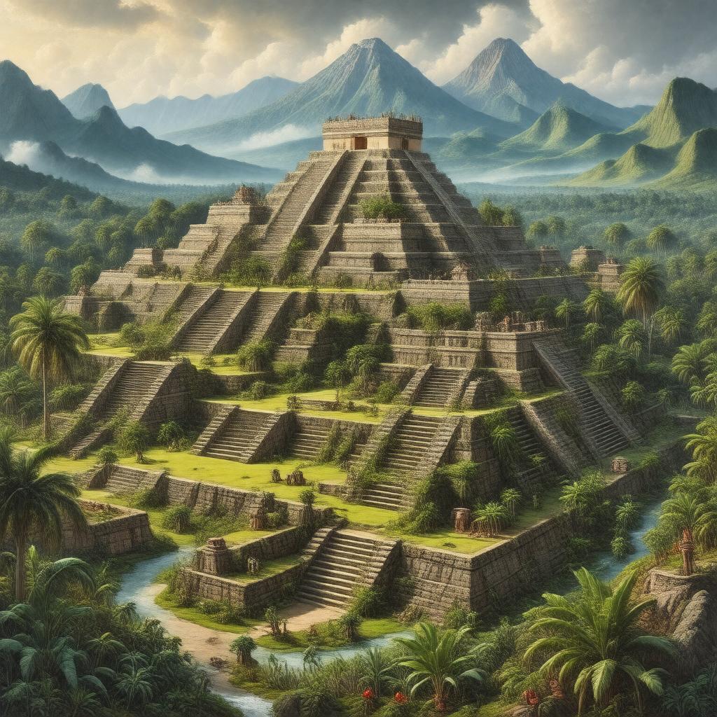 "Generate an image of a vibrant and diverse Mesoamerican landscape, showcasing a sprawling ancient city with step pyramids, ballcourts, and temples in the background, surrounded by lush greenery and winding rivers. Incorporate elements of Olmec, Maya, Aztec, and Zapotec civilizations, such as intricate stone carvings, colorful ceramics, and jade artifacts. Include maize, beans, squash, and chili peppers growing in the foreground, with a majestic volcano looming in the distance. Depict the scene in a warm, golden light, evoking a sense of rich cultural heritage and history, in the style of a National Geographic documentary."