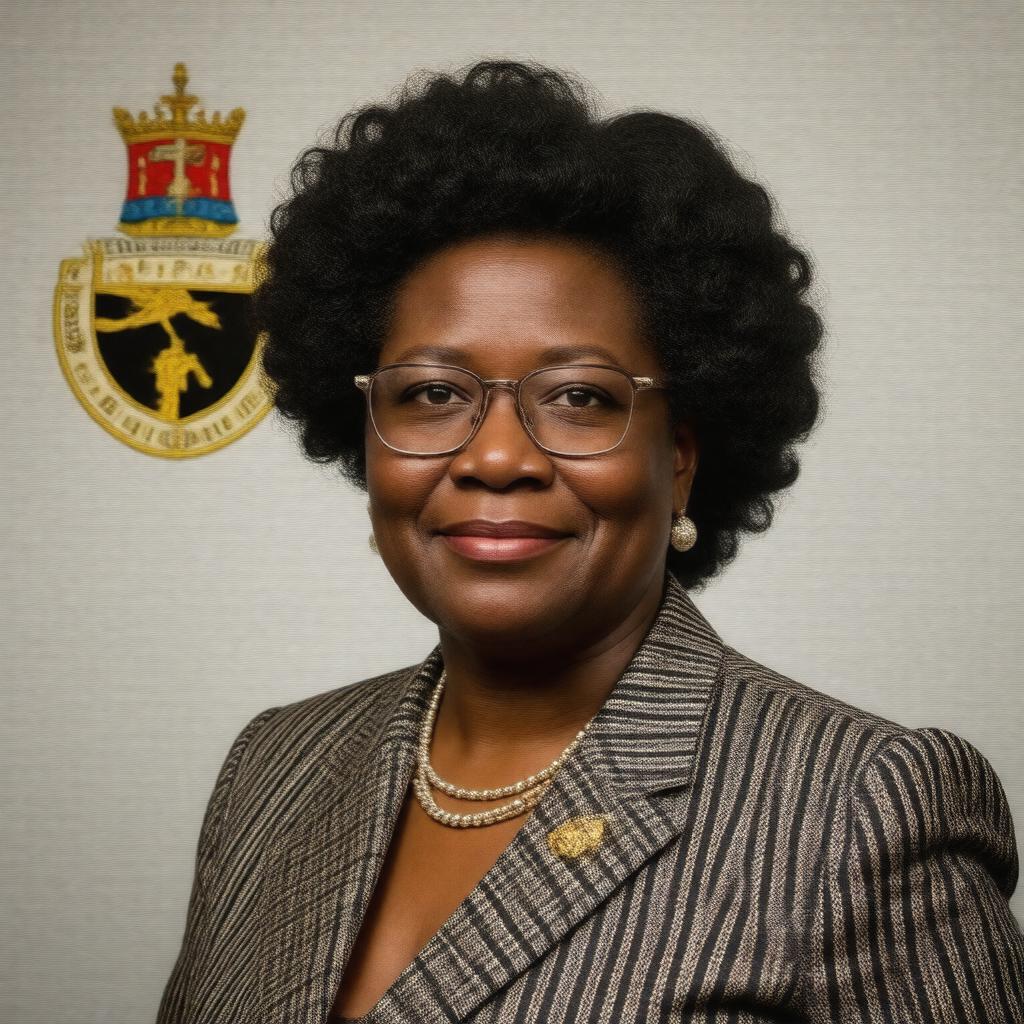Create a realistic portrait image of Mia Mottley, the first female Prime Minister of Barbados, in a formal setting that reflects her role and achievements, wearing attire suitable for a political leader, with a backdrop that could signify Barbados, incorporating subtle elements that nod to her accomplishments and positions held, such as the Barbados Labour Party logo or symbols of her tenure as Prime Minister and Minister of Finance.