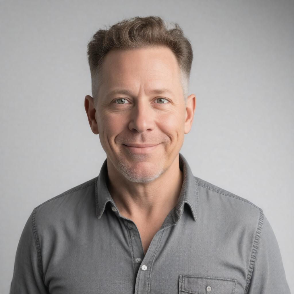 "Generate a realistic portrait of Michael Rapaport, an American actor, comedian, and film director, in a neutral background, showcasing his distinctive facial features and tall stature, wearing a casual outfit, with a subtle smile, at the age of 50, with a cinematic film noir-inspired lighting style."