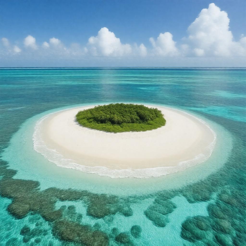 "Generate an image of a remote, tropical atoll with a small, sandy island in the center, surrounded by a coral reef and crystal-clear turquoise waters, under a bright blue sky with a few puffy white clouds, representing Midway Atoll, a UNESCO World Heritage Site and National Wildlife Refuge, with no people in sight, but with a few abandoned military structures and equipment scattered around, in a realistic and serene style."