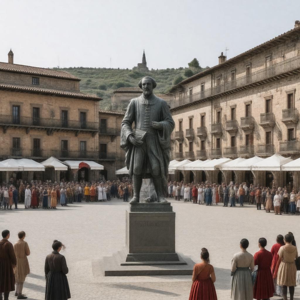 Generate an image of a traditional Spanish town square with a statue of Miguel de Cervantes in the center, surrounded by historic buildings and people dressed in 17th-century attire, reflecting the cultural heritage of Spain, where the given name Miguel originated and is notably associated with the famous author.
