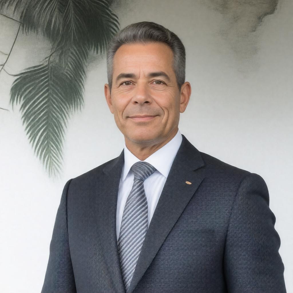 A realistic portrait of Miguel Albuquerque, a middle-aged Portuguese man with a gentle smile, wearing a formal suit and tie, standing in front of a backdrop that subtly suggests the natural beauty of Madeira, with a faint outline of tropical plants or a landscape view, reflecting his connection to the region as President of the Regional Government of Madeira and his background as a botanist, with a confident yet approachable demeanor.