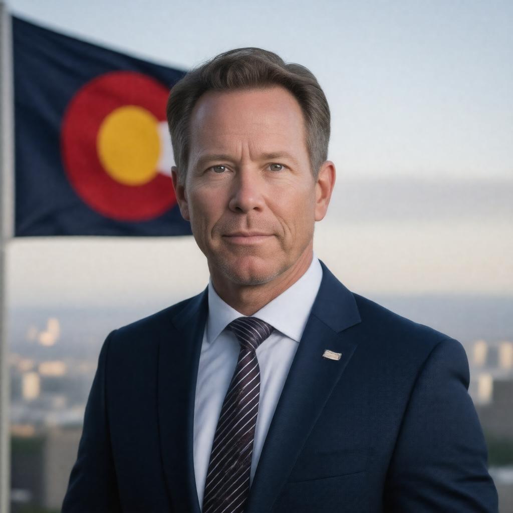 Generate a realistic portrait of Mike Johnston, a middle-aged American man with a professional demeanor, wearing a suit and standing in front of a Colorado state flag or a Denver cityscape, symbolizing his roles as a politician, educator, and former Mayor of Denver and Colorado State Senator, with a subtle background hinting at his involvement in public policy.