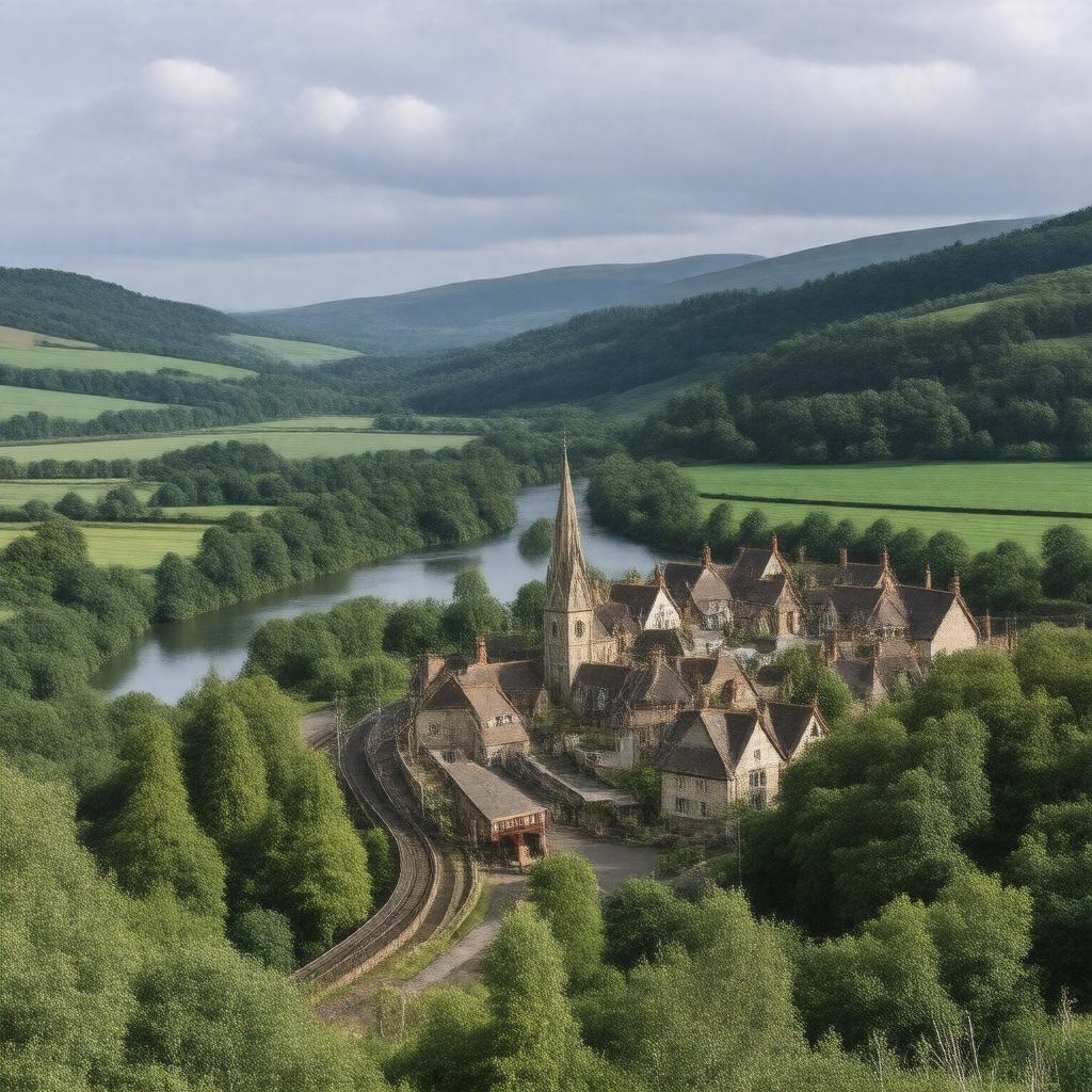 "Generate a realistic image of a small town in England, with a population of around 19,563, situated in a valley near a river, with a railway station, a church, and several schools, surrounded by rolling hills and countryside, in the style of a photograph."