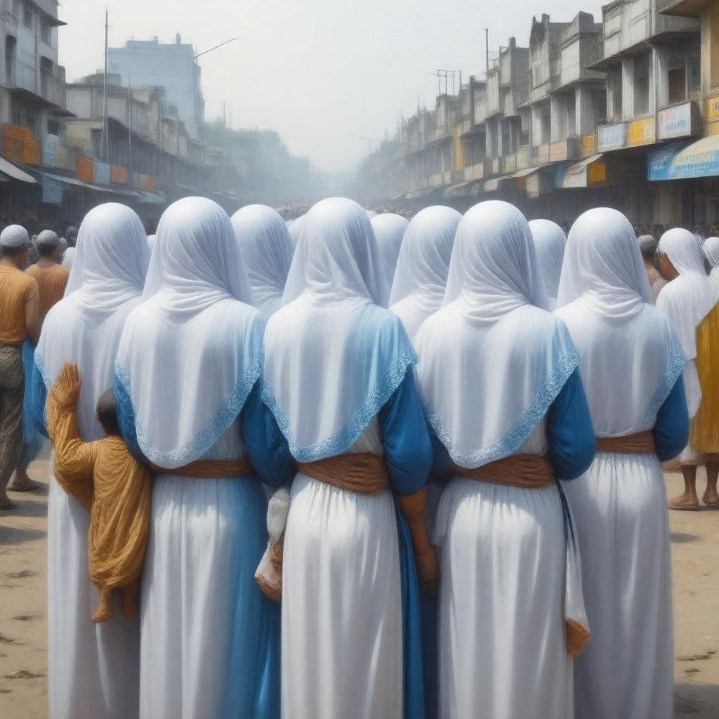"Generate an image of a group of Missionaries of Charity sisters in their traditional white and blue habits, standing in front of a Kolkata cityscape, with a subtle background of people being cared for, such as the sick, poor, and orphaned, conveying a sense of compassion and service, in a realistic and heartwarming style."
