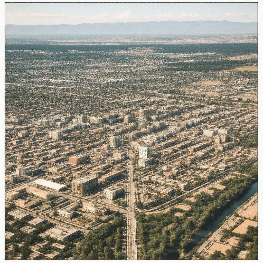 "Generate a realistic image of Modesto, California, a city in the United States, showcasing its vibrant downtown area with a mix of agriculture and food processing industries, surrounded by the Tuolumne and Stanislaus rivers, with a Mediterranean climate, in a daytime setting with clear skies, incorporating elements that reflect its nickname 'Water Wealth Contentment Health'."