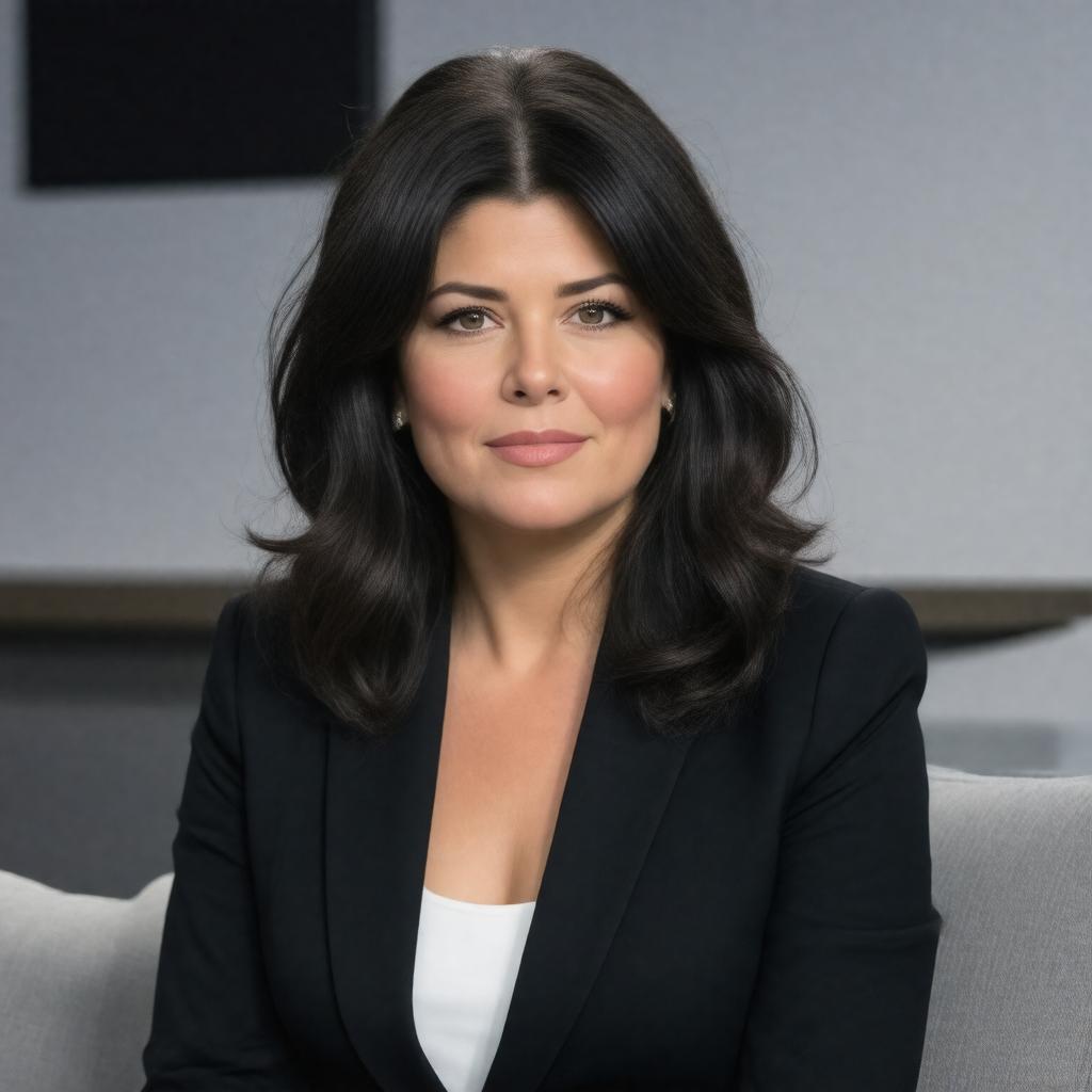 Create a realistic portrait of Monica Lewinsky, a middle-aged American woman with a professional and confident demeanor, sitting in a modern setting with a subtle background that hints at her activism and public speaking career, wearing attire that reflects her fashion design interests, with a gentle and determined expression, in a style that blends contemporary realism with a touch of sophistication.