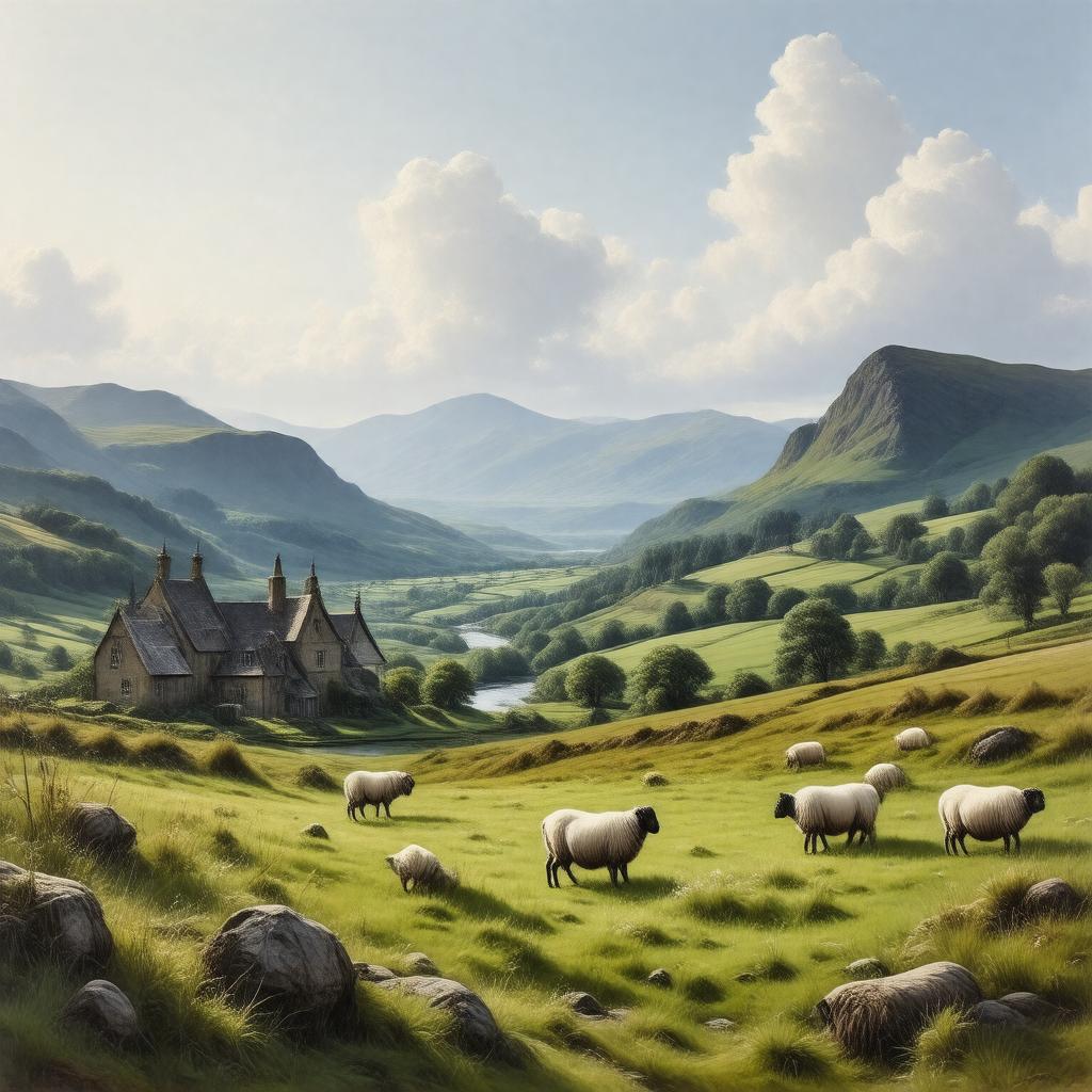"Generate an image of a scenic landscape representing Montgomeryshire, a historical region in Wales, United Kingdom. Depict rolling hills, valleys, and mountains, with a few traditional Welsh cottages and a castle in the distance. Include a river, such as the River Severn or River Vyrnwy, flowing through the landscape. In the foreground, feature a few sheep grazing in a green meadow. The style should be reminiscent of a 19th-century watercolor painting, with soft colors and gentle brushstrokes. The image should evoke a sense of serenity and tranquility, capturing the essence of this picturesque region."
