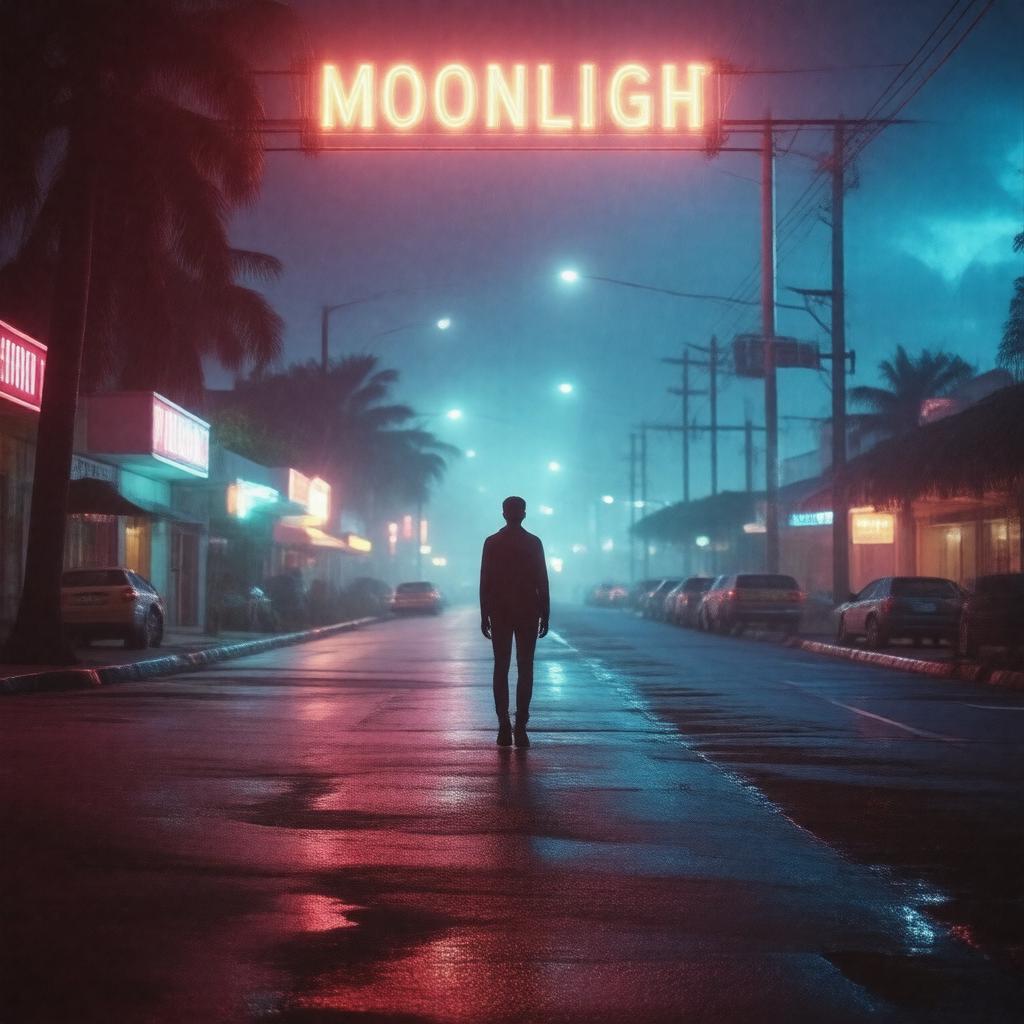"A cinematic poster of the film Moonlight, a drama movie released in 2016, directed by Barry Jenkins, with a moody and introspective neon-lit nighttime scene set in Miami, showcasing the film's themes of African-American experience, LGBTQ identity, and coming-of-age, in a stylized and film-noir-inspired visual style."