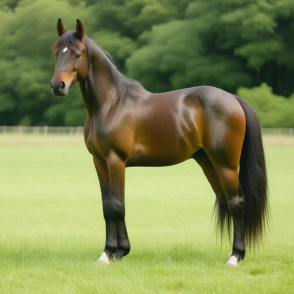 "A majestic Morgan horse, with a compact and muscular build, standing proudly in a lush green meadow, showcasing its upright neck, expressive head, and strong legs, with a shiny bay coat, and a friendly disposition, in a realistic and vibrant style, symbolizing the breed's intelligence, willingness, and gentle nature."