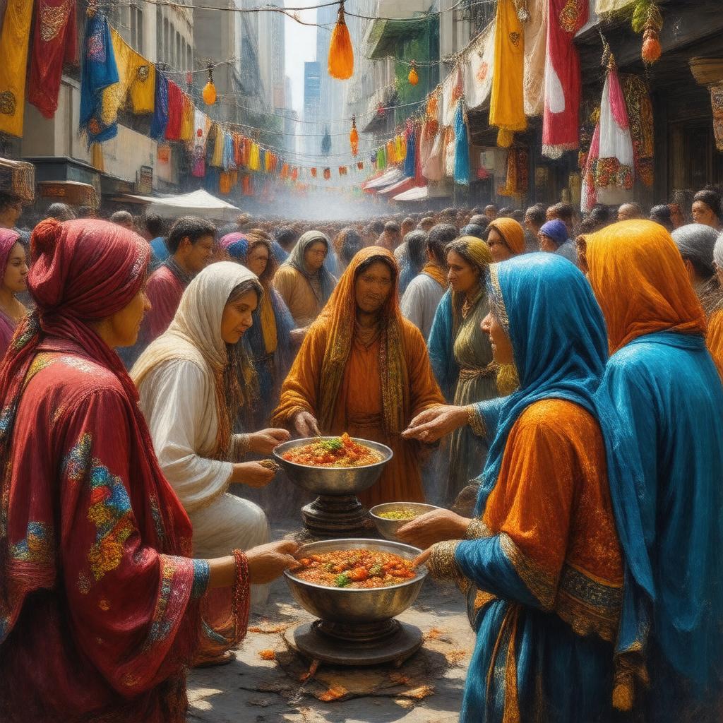 "Create an image of a vibrant Moroccan American community celebration, with people of diverse ages and backgrounds gathered together, surrounded by traditional Moroccan decorations, food, and clothing, in a colorful and lively atmosphere, set against the backdrop of a major American city like New York City or Los Angeles."