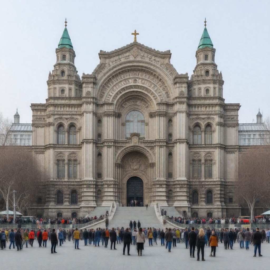 "Generate an image of a large, eclectic-style synagogue with a mix of architectural elements, located in a urban setting, during daytime. The building should have a prominent main prayer hall, a women's gallery, and other facilities such as a mikveh, kosher restaurant, Jewish museum, library, school, and cultural center. The synagogue, known as the Moscow Choral Synagogue, should be depicted at Bolshoy Spasoglinishchevskiy Lane, 10, in Moscow, Russia, with a crowd of people, including Jewish worshippers and tourists, in front of it. The image should reflect the building's status as a cultural heritage monument of regional significance and the main synagogue of Moscow."