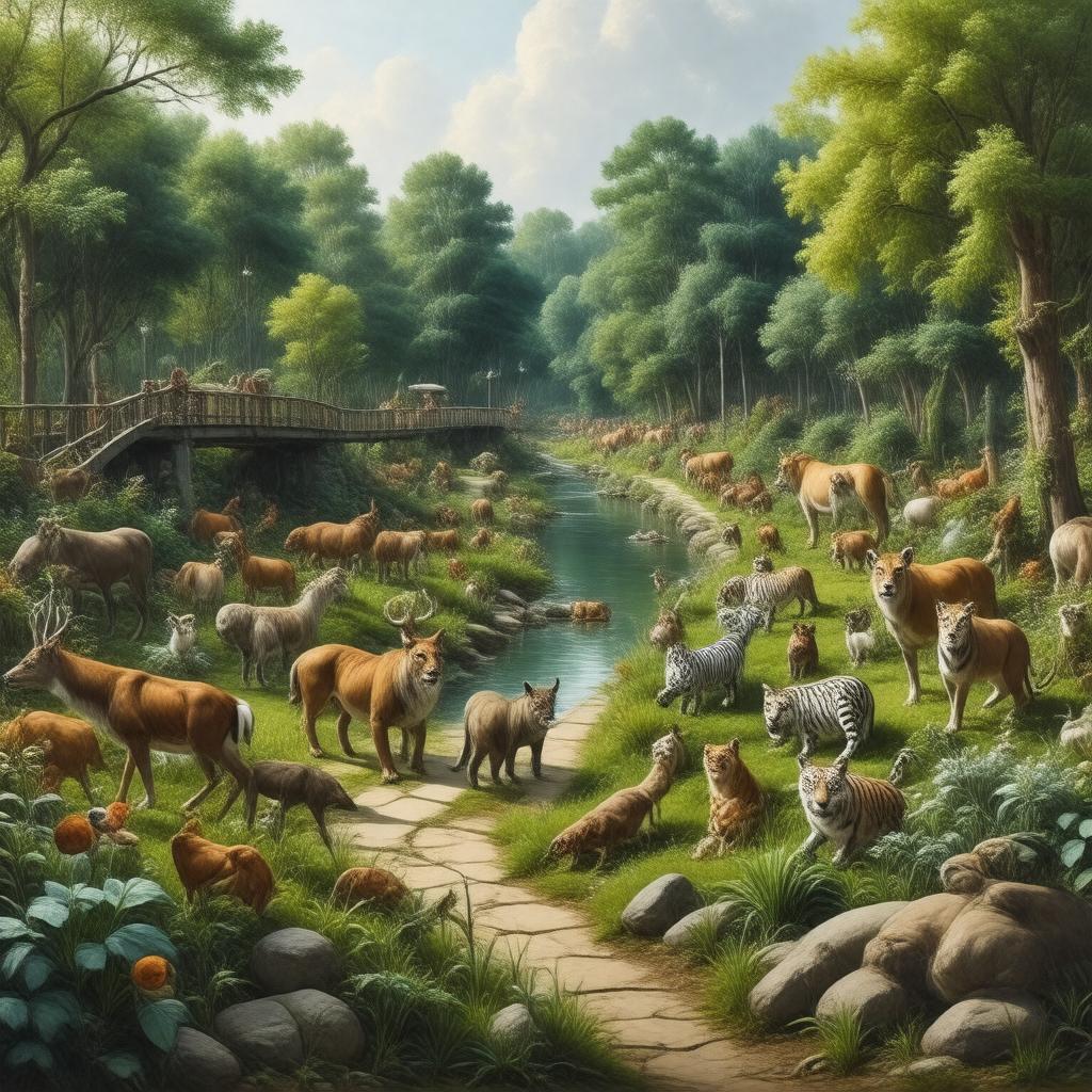 "Generate an image of the Moscow Zoo, a large wildlife park located in Moscow, Russia, featuring a variety of animals such as deer, Amur tigers, lions, snow leopards, and birds, with exhibits like the Night World, Reptile House, and Children's Zoo, set amidst lush greenery and walkways, with a pedestrian bridge over Bolshaya Gruzinskaya Street in the background, in a realistic and vibrant style."