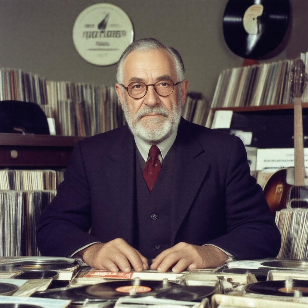 Create a realistic portrait of Moses Asch, a middle-aged man with a gentle expression, sitting in a recording studio surrounded by vinyl records and musical instruments. He is dressed in attire typical of the mid-20th century, reflecting his American Jewish heritage. The background should subtly hint at his contributions to music, possibly with a logo or records from Folkways Records visible. The style should be photorealistic, capturing the essence of a man who dedicated his life to preserving and promoting folk music, spoken word, and world music.