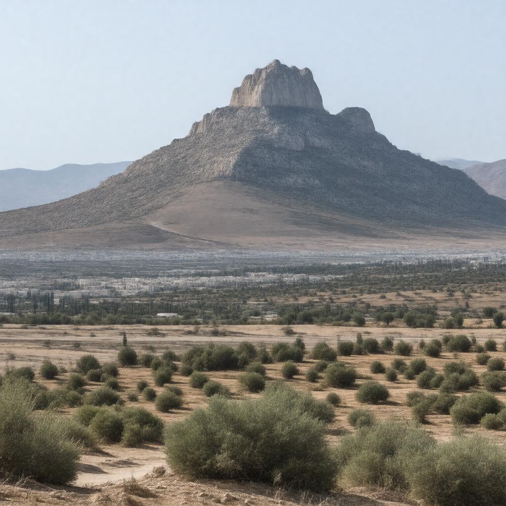 "Generate an image of a mountainous landscape with a prominent peak, situated in a desert-like environment, overlooking a city in the distance. The peak, Mount Gerizim, should be rendered in a realistic style, with a height of 881 meters, surrounded by a national park. In the foreground, include a small settlement, Kiryat Luza, and an archaeological site of an ancient Samaritan temple. The image should convey a sense of serenity and grandeur, reflecting the significance of the mountain in the Samaritan religion and its mention in the Hebrew Bible. The coordinates 32.2131°N 35.2722°E should be used as a reference for the geographical location. The style should be photorealistic."
