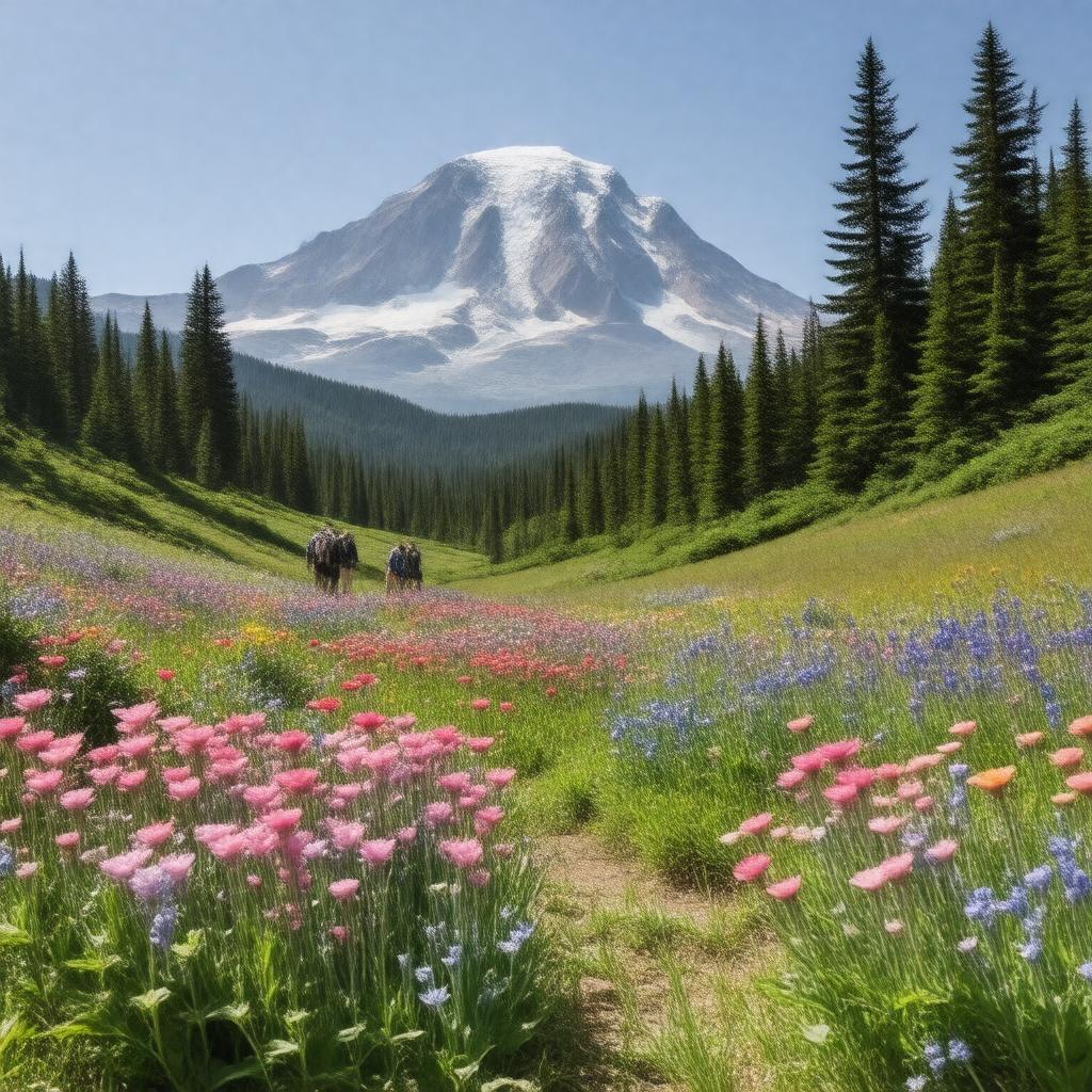 "Generate an image of a breathtaking landscape in a national park, surrounded by subalpine meadows, old-growth forests, and majestic mountain peaks. In the center, Mount Rainier, a prominent volcanic mountain, rises to 14,411 feet, its glaciers and snow-capped summit glistening in the sunlight. In the foreground, wildflowers of various colors bloom, and a few hikers can be seen on the trails of the 93-mile Wonderland Trail, with the Paradise Jackson Visitor Center and Longmire Museum in the distance. The scenery is representative of Mount Rainier National Park in Washington, United States, a nature reserve and popular destination for outdoor activities such as hiking, mountaineering, camping, and wildflower viewing."