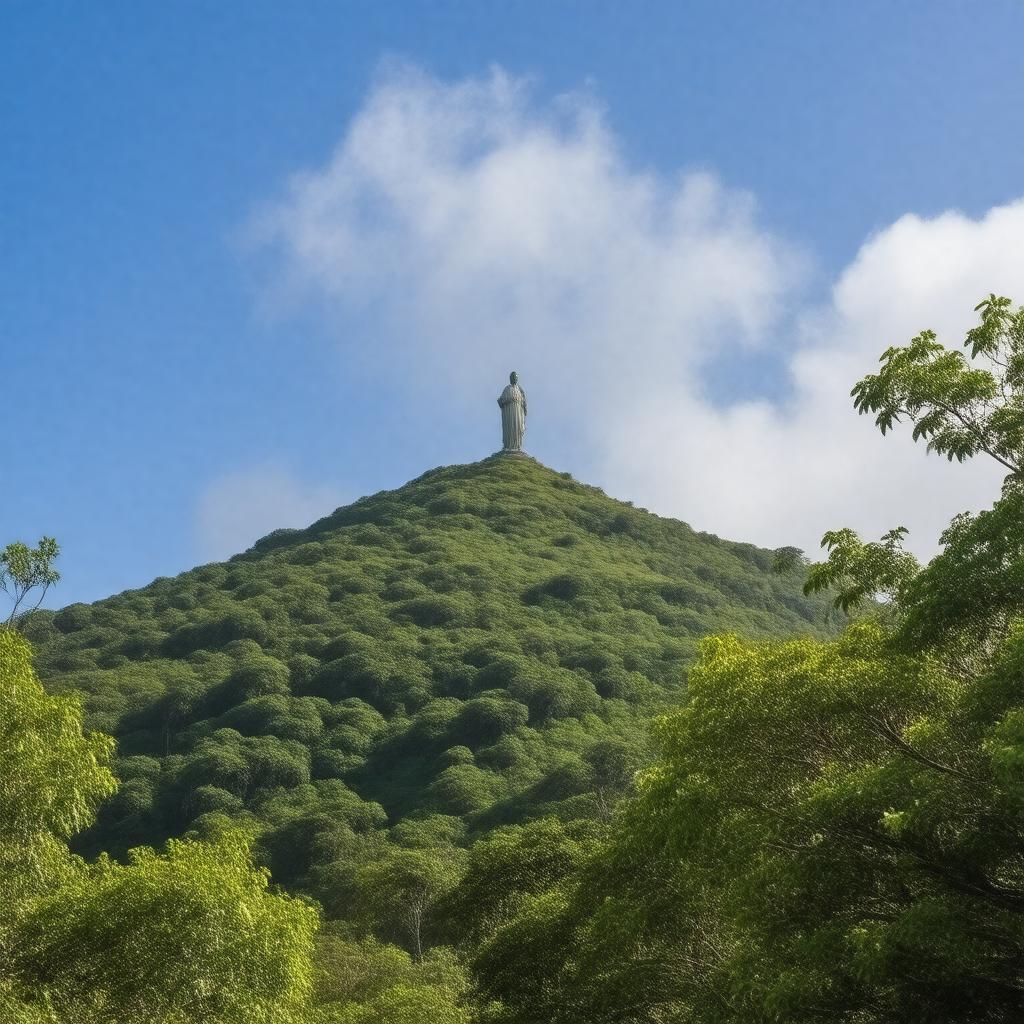 "Generate a realistic image of Mount Ramelau, also known as Tatamailau, the highest point in East Timor and Timor Island, located in Ainaro District, with a statue of the Virgin Mary at its peak, surrounded by lush greenery and rugged terrain, under a serene blue sky with a few wispy clouds, in a style that captures its majestic and spiritual significance."