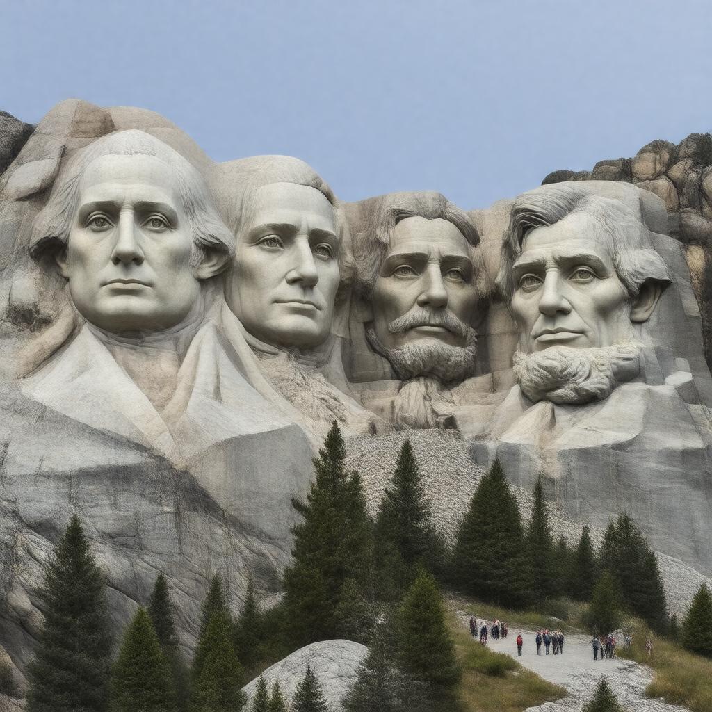 "Generate a realistic image of the Mount Rushmore National Memorial, a monumental sculpture carved into the side of a mountain in the Black Hills of South Dakota, United States. The sculpture features four large heads of U.S. presidents: George Washington, Thomas Jefferson, Theodore Roosevelt, and Abraham Lincoln. The image should capture the grandeur of the monument, with the four presidential heads prominently displayed, and the surrounding landscape of the Black Hills in the background. The style should be photorealistic, with detailed textures of the granite mountain and the sculptures. Include the Presidential Trail, a popular walking path that allows visitors to view the monument from different angles, and a few visitors in the distance to provide scale."