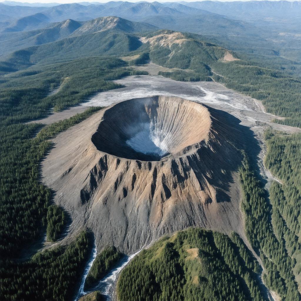 "Aerial view of Mount St. Helens, a stratovolcano in the Cascade Range, Washington, United States, with a prominent horseshoe-shaped crater and surrounded by lush greenery, snow, and Spirit Lake, on a clear day with a hint of volcanic activity."